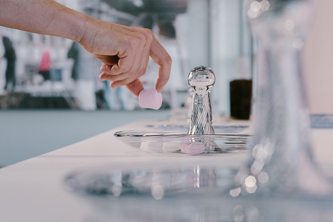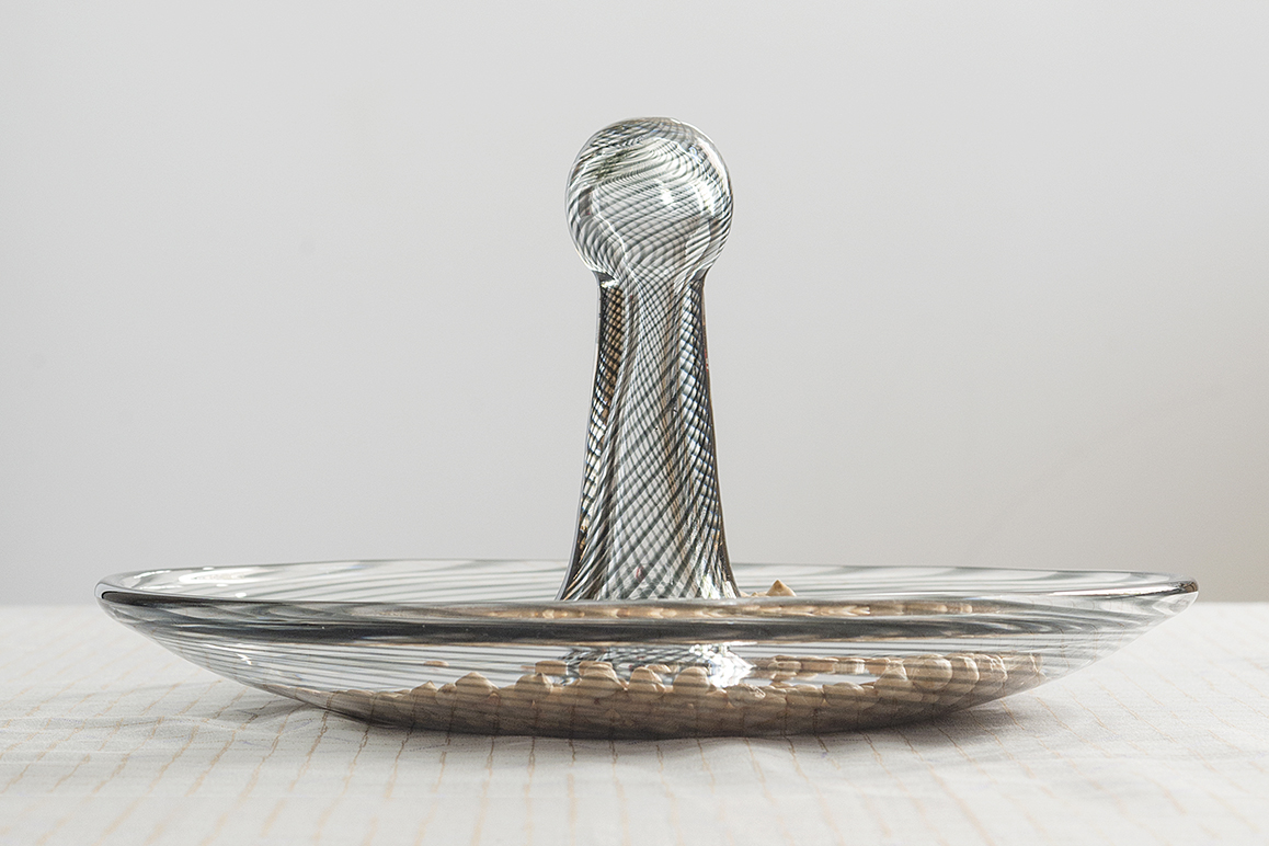 Deux pièces sont proposées avec cette technique historique. Une coupelle à poignée centrale, qui renferme un monde miniature de fligranes entralacées, permet de la déplacer aisément. Elle existe en filigrane noir ou en filigrane à rayures alternées bleues et noires. Ce rythme bicolore est appliqué à la grande assiette à l’exceptionnel diamètre de 48 cm. Elle est divisée en deux concavités concentriques, pour distinguer ce qu’on y présente: noix et pommes, chocolat et guimauve, ou bagues et colliers… Ces pièces exceptionnelles sont soufflées en Finlande par les maîtres verrier de la Glass Factory d’Iittala.