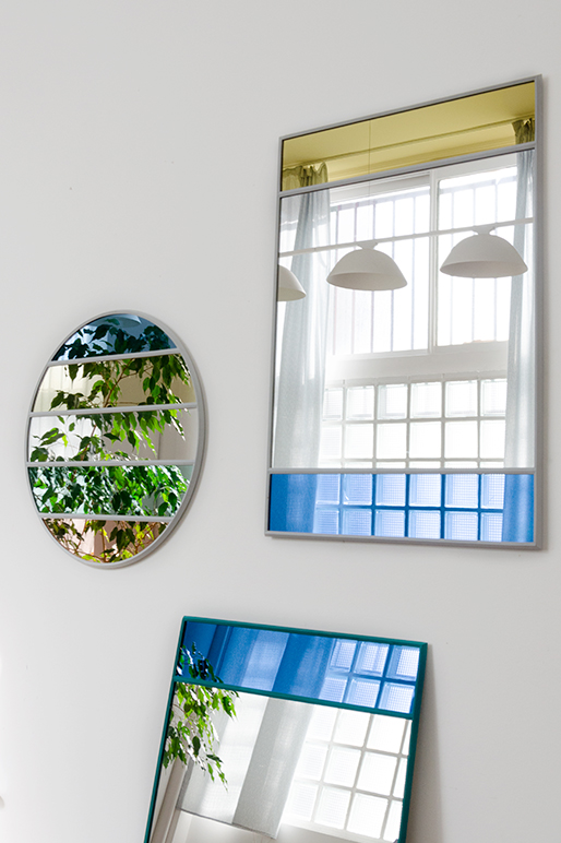 With a mirror you can see yourself, but above all you can liven up a wall and light up a room, as if it were a window or a lamp always left on. In antique shops you can often find what we know as Venetian mirrors, in which the central glass is surrounded by other smaller pieces of mirror, a simple and attractive way to both frame and reflect. I wanted to develop this idea in the Vitrail collection, combining clear and coloured mirrors. I created mirrors made up of several pieces in contrasting colours. They are held together by an injection moulded rubber frame: its softness allows the fragments to be inserted into the triangular gaps in the thin rubber structure. Vitrail comes in four different formats which can be hung horizontally or vertically. The collection includes a small square, a large rectangle, and an oval, all made up of a large, clear, central mirror decorated with two coloured fragments. These versions are injected in both colours; each one features a distinctive combination of lateral mirrors. The fourth model is round, and is divided into five strips. It comes in two contrasting versions: a light grey frame with fragments of pastel green glass, and a green frame with fragments of mirror fading from black through to light grey. It can be hung in three ways: horizontally, vertically or diagonally.
